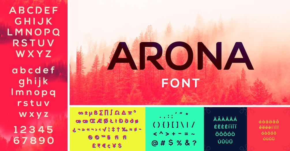 Arona is a bold geometric rounded font which make your work look neat and rich. Create Awesome End Products for your customers today with this Arona font. It has 267 GLYPHS (A-Z, a-z, 0-9 - Punctuations - Accents - Special characters).