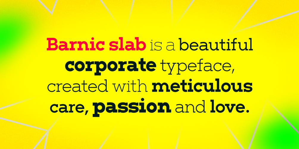 Barnic Slab is a modern geometric slab typeface tailored to elevate all your design projects, from UI and app design to web design, branding, posters, magazines, infographics, packaging, and beyond. With its sharp slab edges, Barnic Slab effortlessly radiates professionalism and trustworthiness. Boasting 12 font weight variations, Barnic Slab excels in delivering a multi-level content hierarchy in your design, ensuring your value is communicated clearly and easily. Whether you're looking for a font for branding, web design, or print materials, Barnic Slab is the perfect choice.